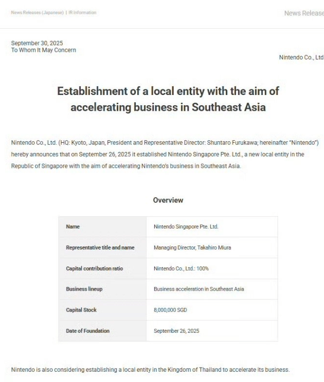 任天堂宣布于2025年9月26日成立「任天堂新加坡私人有限公司」,由古川俊太郎 担任社长兼代表董事,负责东南亚地区的业务推广。