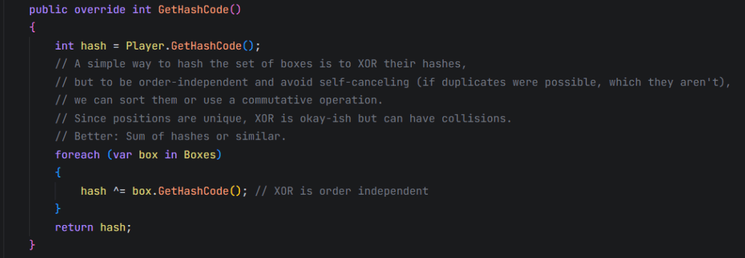 这个写法还不错,因为它保证了箱子交换顺序后,Hash 不变。但也有一个不那么好的地方,就是玩家和箱子交换位置后,Hash 也不变,但这其实是不同的状态,可能会导致碰撞。我们做一点修改: