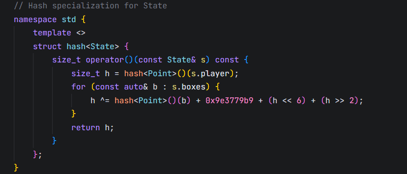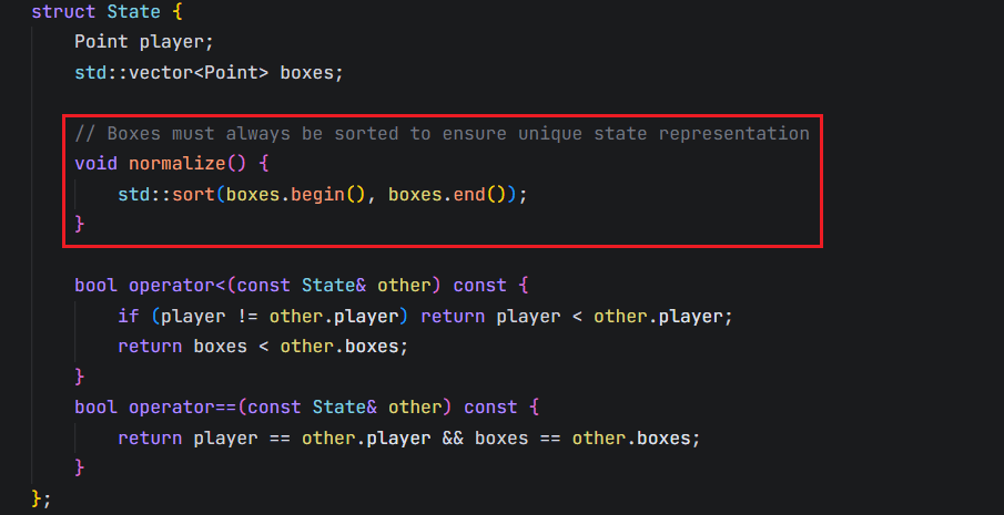 由于箱子应当是无序的,所以给状态类加了一个正则化方法,在作为键插入 std::map 前对状态中的箱子做字典排序,保证 std::map 中不会插入等价的两个状态。