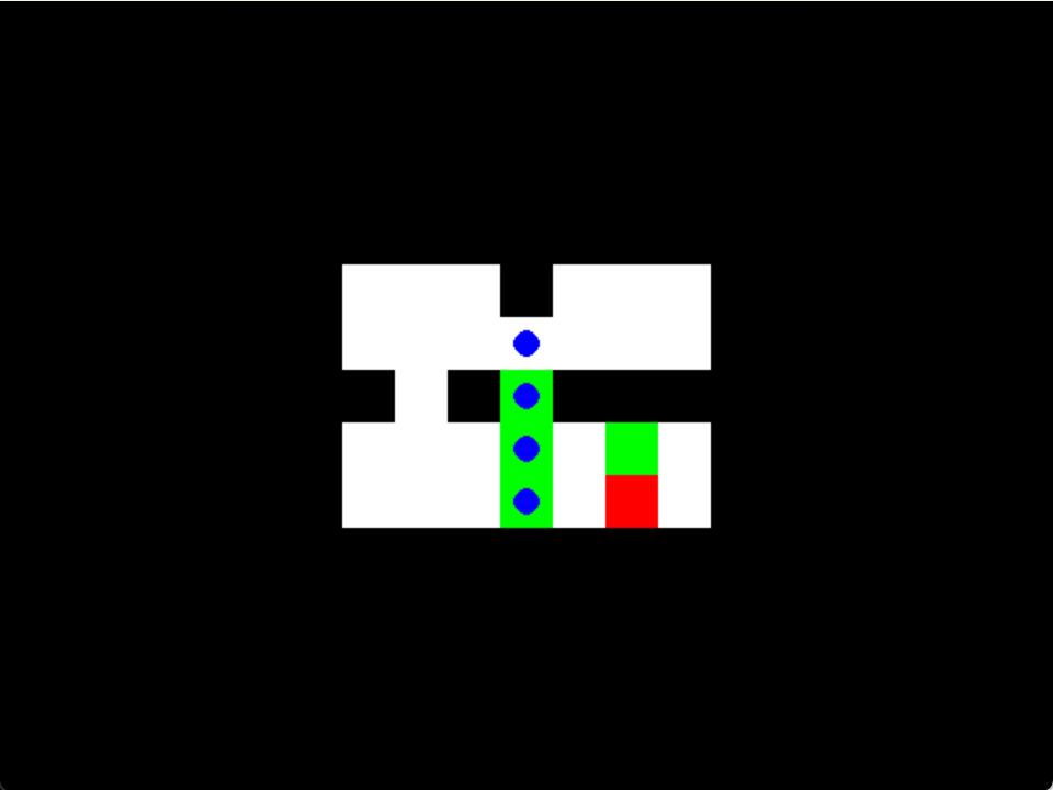 推箱子是一个有限状态机,可以用玩家和箱子的坐标来表示全部状态。我使用固定大小的 Numpy 数组来表示状态,比如上面这个关卡中,玩家的坐标是 [4, 5] ,三个箱子的坐标是 [1, 3]、[1, 5]、[3, 4],那么状态是 np.array([[4, 5], [1, 3], [1, 5], [3, 4]]) ,其中第一行为玩家,后几行顺序随意。