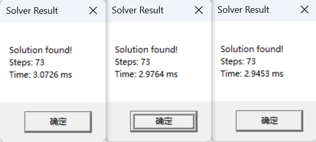 如果只是要找到能否通关,而不考虑步数,我们还可以进一步优化。先设定玩家的移动不消耗步数,只有推箱操作消耗步数。从而,在某个状态下,我们进行一次小的搜索,计算玩家下一次推箱操作有哪些可能性,然后直接计算这些状态作为下一步状态,这样可以避免遍历那些玩家只是走来走去但不推箱子的垃圾状态。依此优化后(从现在开始,我只提思路,具体实现都让 AI 来写):